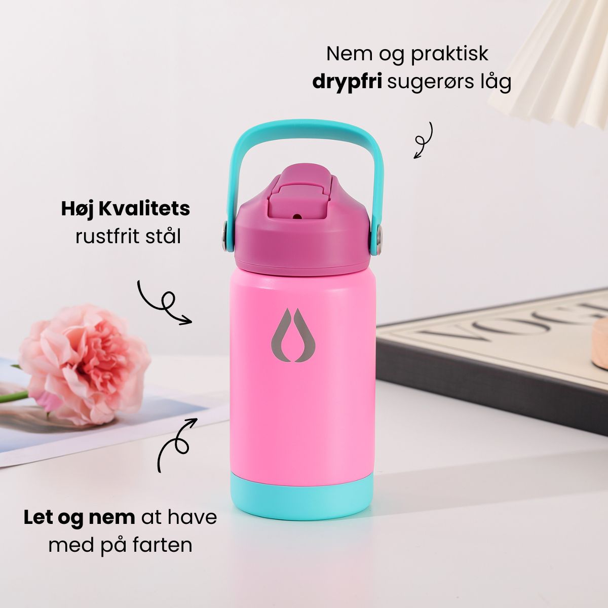 Flasken med sugerør låg (samt sugerør inde i flasken) gør det nemmere – og renere – at holde sig hydreret. Flasken er lavet i rustfrit stål med dobbeltvægget vakumisolering,
