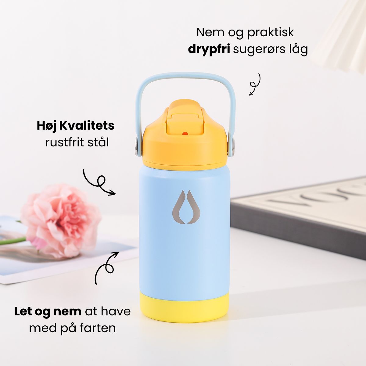 Flasken med sugerør låg (samt sugerør inde i flasken) gør det nemmere – og renere – at holde sig hydreret. Flasken er lavet i rustfrit stål med dobbeltvægget vakumisolering,