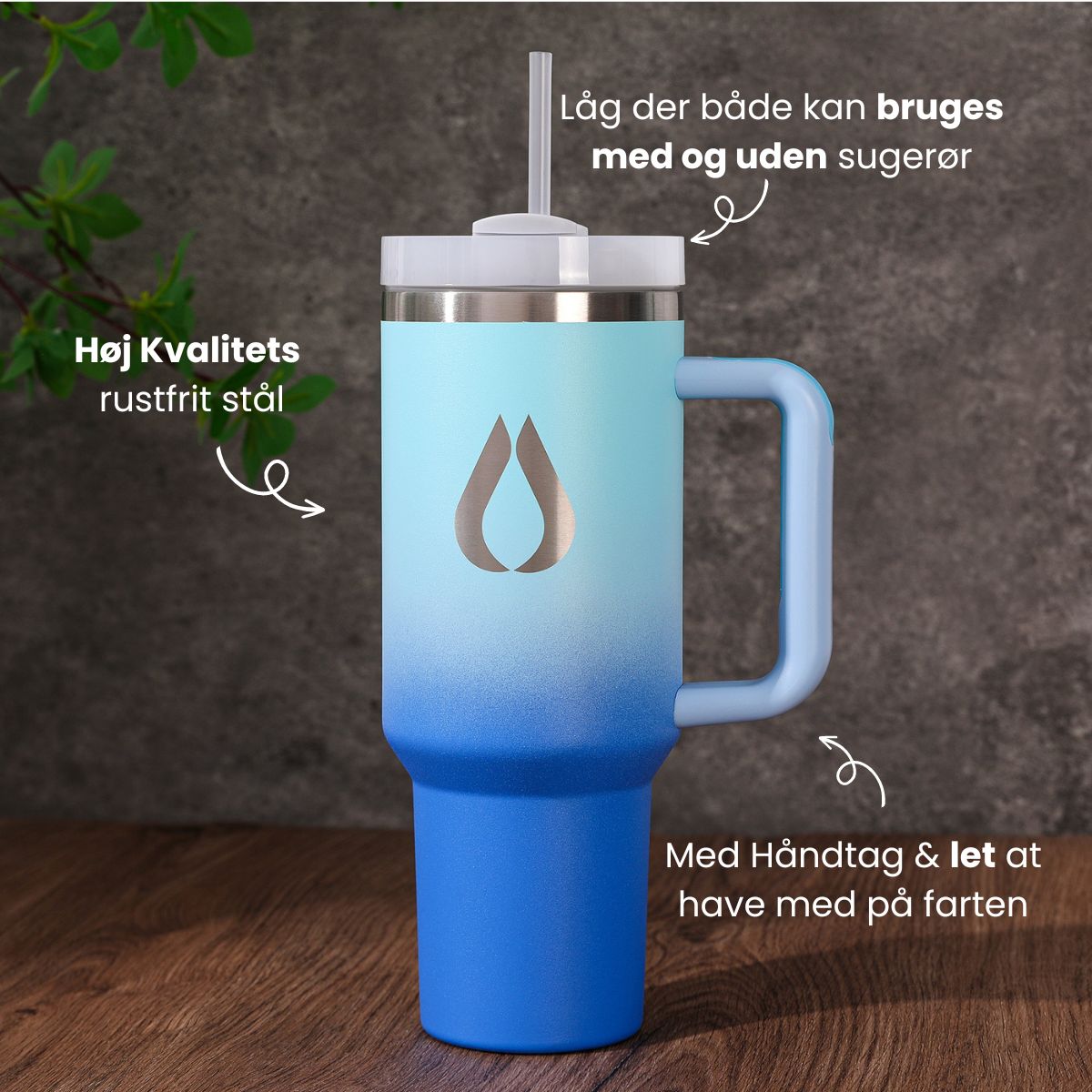 Flasken kan indeholde 1180 ML Væske og gør det super nemt at have masser af vand, kaffe, sodavand eller andet med på farten.