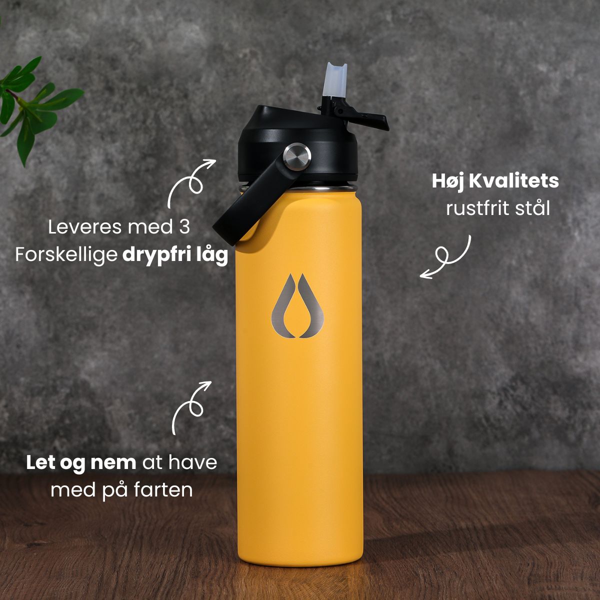 Alle vores flasker at lavet af høj kvalitets rustfrit stål som ikke kan ruste og gør det super nemt at rengøre flasken. Flasken er med vakumisolering så væsken holder temperaturen i meget lang tid.