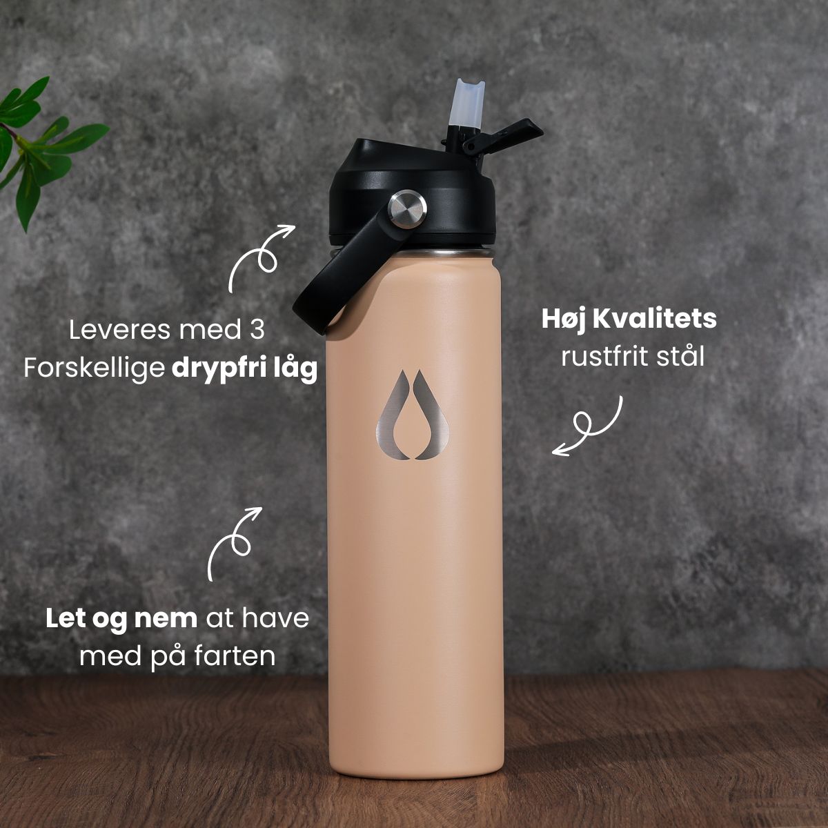 Alle vores flasker at lavet af høj kvalitets rustfrit stål som ikke kan ruste og gør det super nemt at rengøre flasken. Flasken er med vakumisolering så væsken holder temperaturen i meget lang tid.