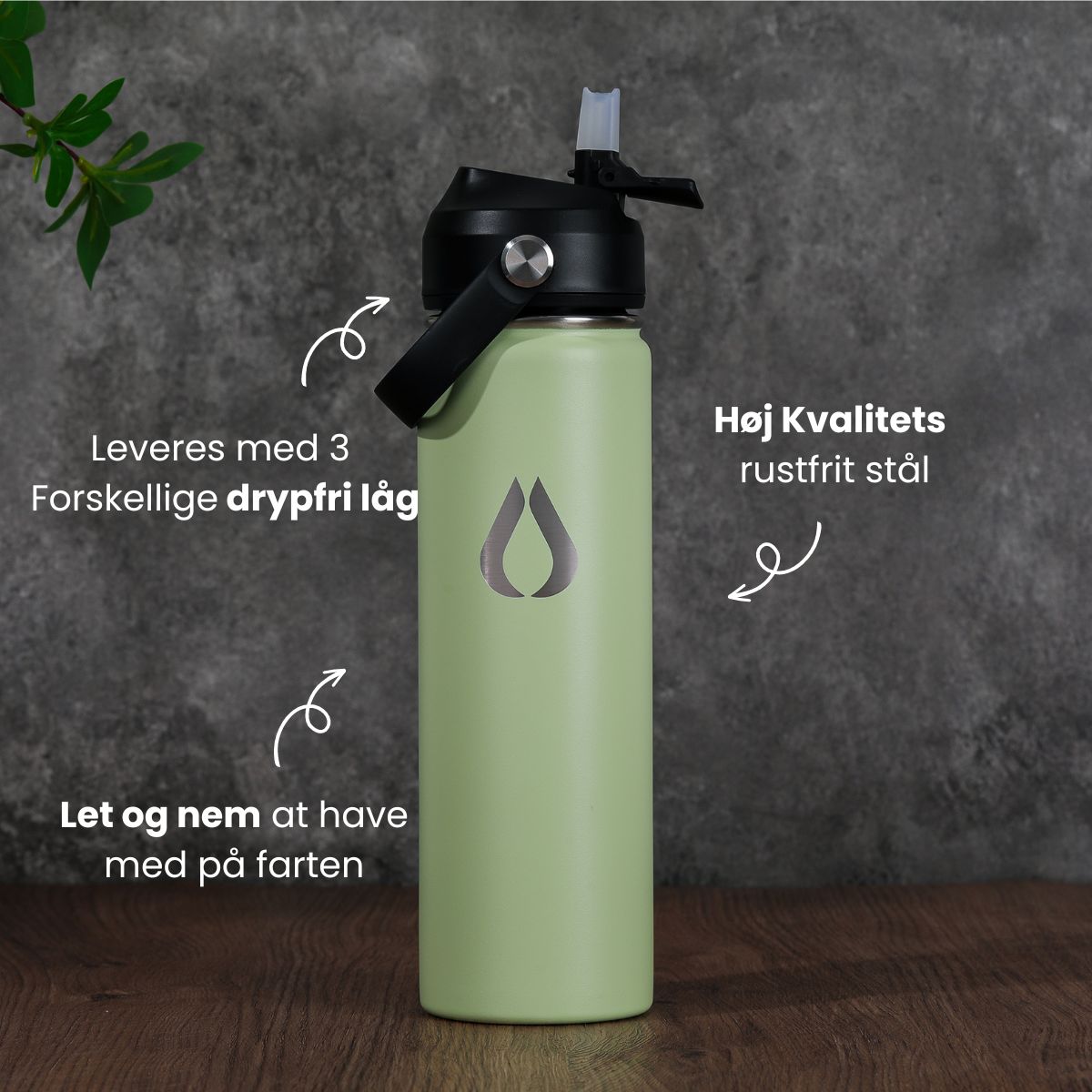 Alle vores flasker at lavet af høj kvalitets rustfrit stål som ikke kan ruste og gør det super nemt at rengøre flasken. Flasken er med vakumisolering så væsken holder temperaturen i meget lang tid.