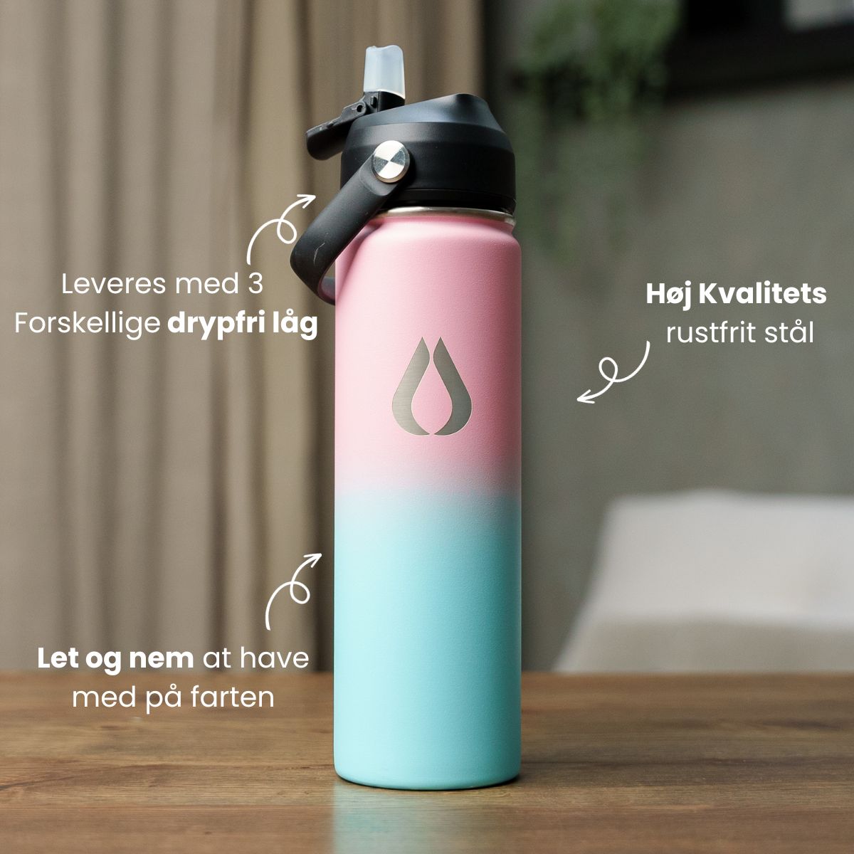 Alle vores flasker at lavet af høj kvalitets rustfrit stål som ikke kan ruste og gør det super nemt at rengøre flasken. Flasken er med vakumisolering så væsken holder temperaturen i meget lang tid.