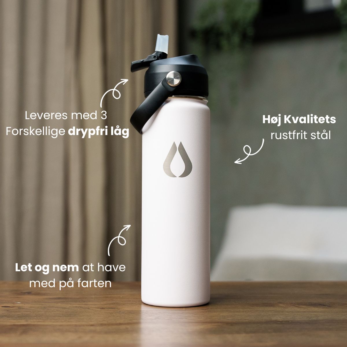 Flasken med tre forskellige låg gør det nemmere – og renere – at holde sig hydreret end